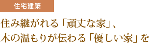 数々の家を手がけ、何よりも家の大切さを第一に考えてきた私どもがご提案するのは「長く住める家」、そして住む人が「やすらげる家」。それが伝統的な在来工法にこだわった木の家です。日本の気候風土に合った木の家は、しっかり建てれば耐久性も高く、居住空間としての安全性、快適性にも優れています。また、月日を重ねるにつれ、独特の色調、光沢、風合いを増していきます。そこに住む人を見守りながら、一緒に成長していく家…。私どもは、そんな木の家の魅力を多くの方に紹介しながら、家を建てられる方一人ひとりの熱い想いに応えていきたいと考えています。
